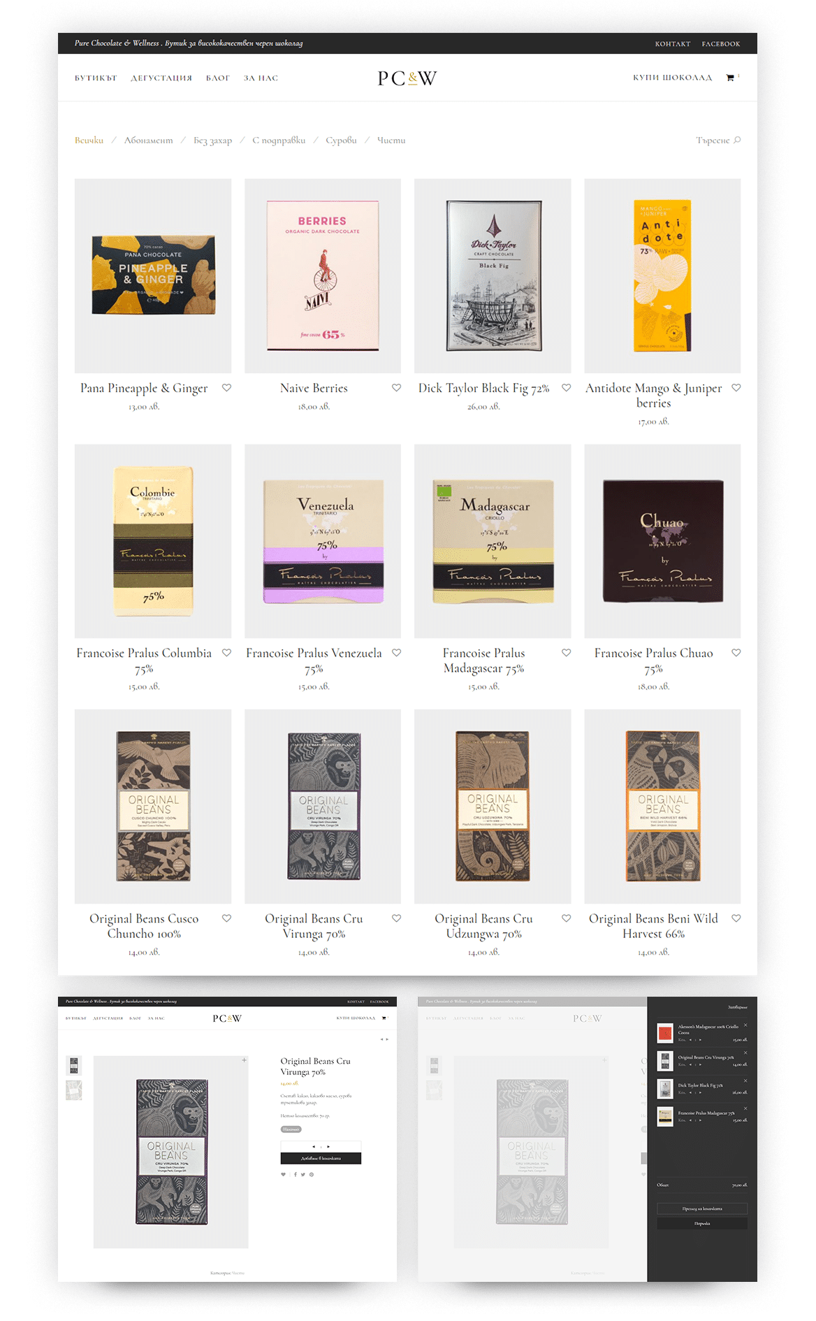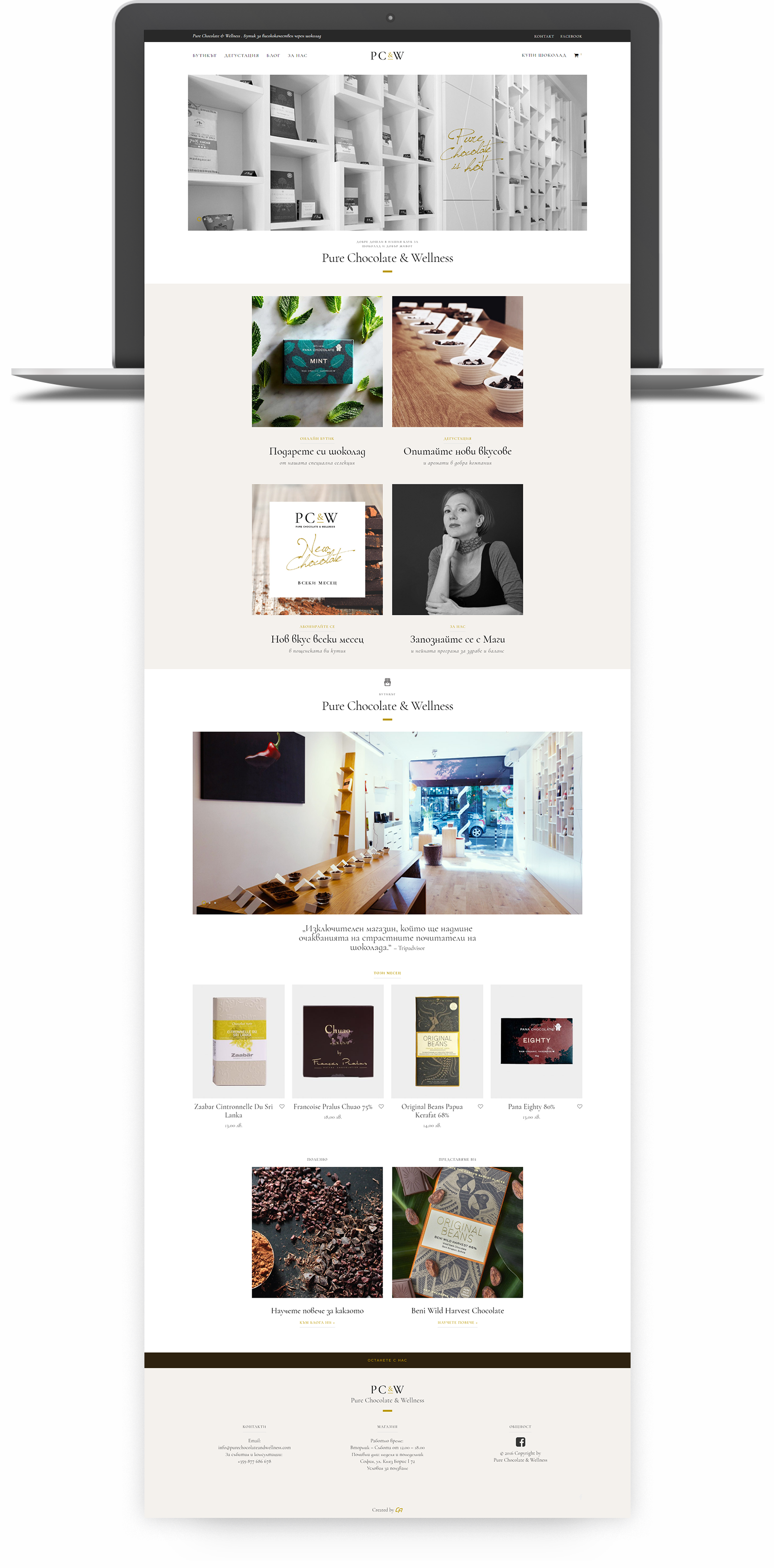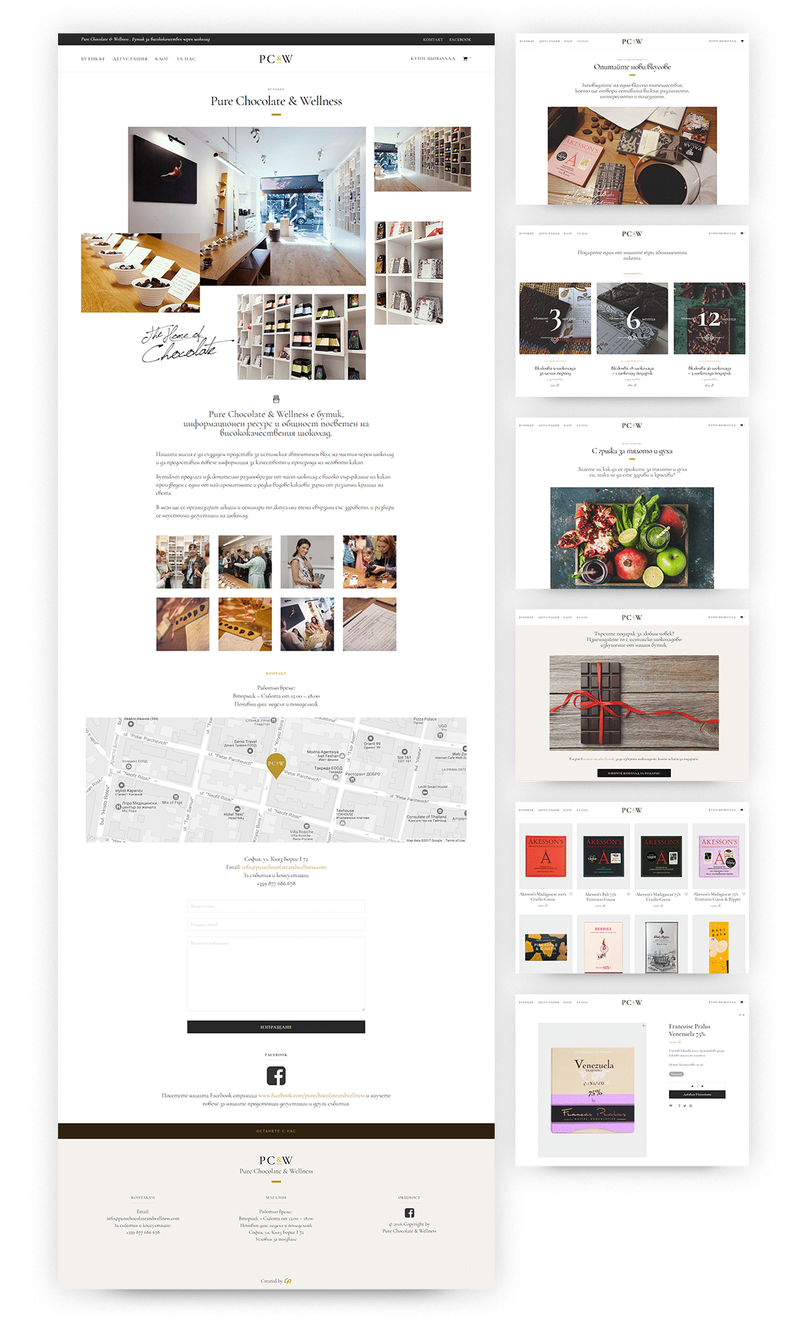 I worked with the nutritionist and entrepreneur Maggie Curlette to bring her Pure Chocolate & Wellness concept to the web. Starting as a small chocolate boutique in Sofia, PC&W has soon turned into a club for good & healthy living and it's connoisseurs.